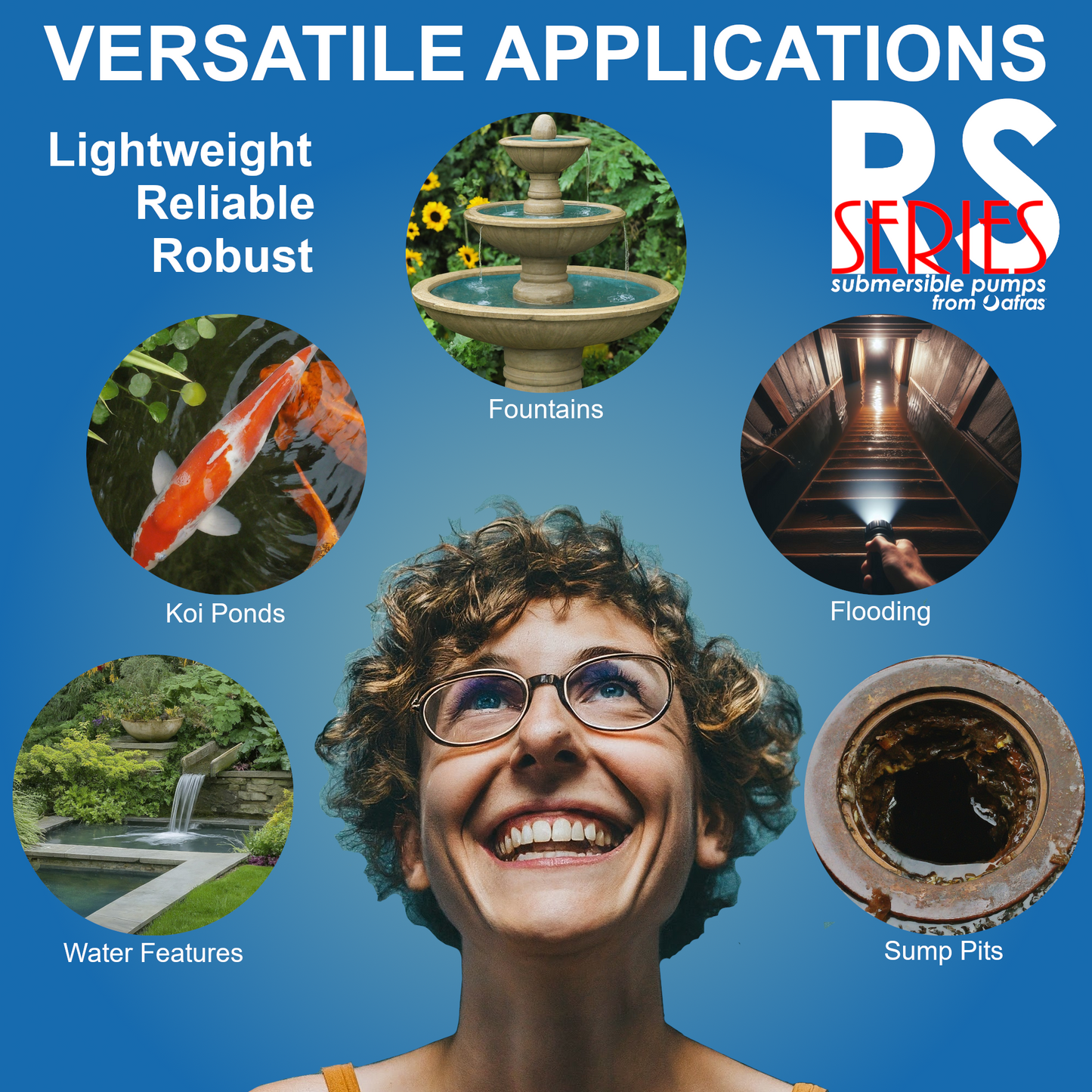 Non-corrosive super tough, glass reinforced thermoplastic motor housing, pump casing and impeller. High efficiency motor, IP 68 protection, F class insulation. Built-in thermal overload protector. High reliability with double mechanical seals that prevent any moisture from getting into motor. Light-weight and simplified construction. Robust design for long service life. High efficiency for cost effective pumping. Equipped with float switch in RS-A models and Electronic Control in RS-E for automatic operation. Applications: Sump-pit, garden spraying, fountain, waterfall, toilet, laundry, car wash, irrigation, pool, spa, koi pond, and various portable usages.